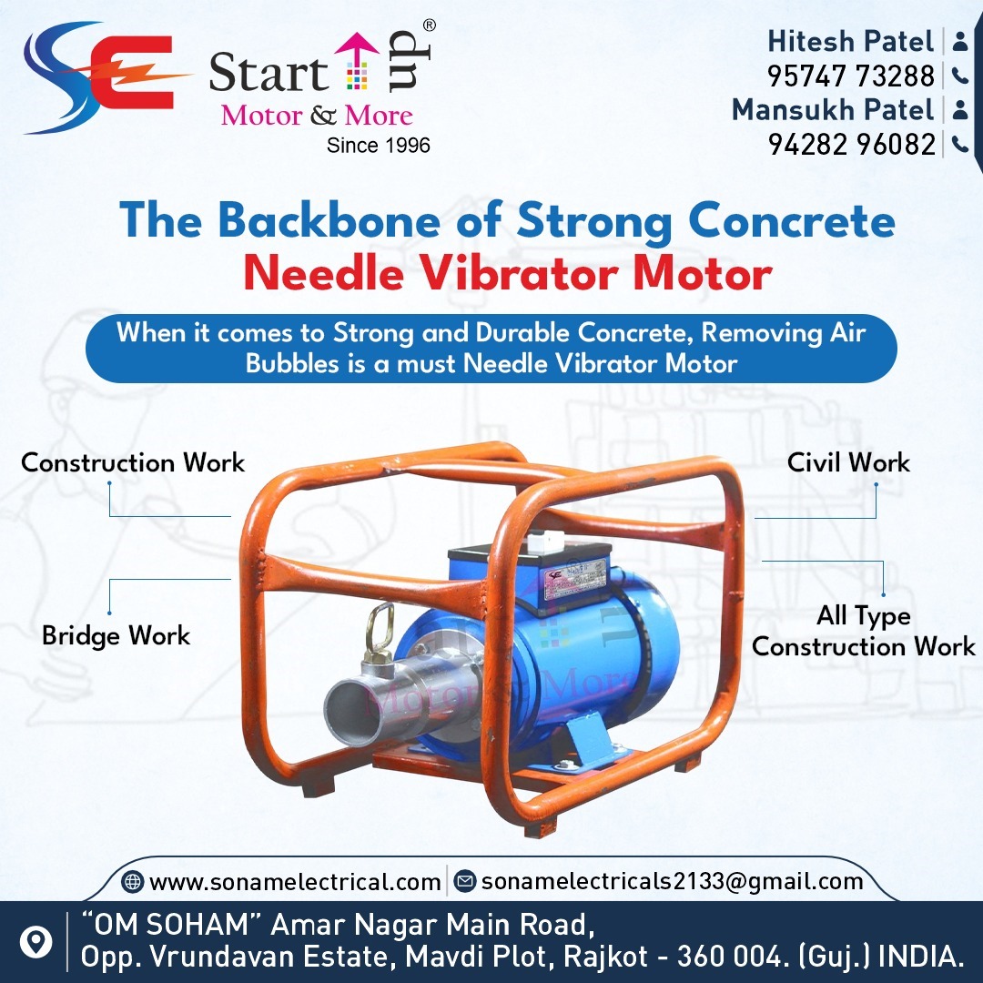 A Needle Vibrator Motor (AC) is a specialized high-frequency induction motor used primarily in the construction and civil engineering industries. Its main purpose is to drive a flexible shaft connected to a vibrating "needle" (poker) to consolidate concrete.